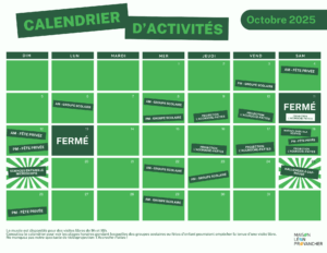 Découvrez notre tout nouveau calendrier d’activités de Octobre en cliquant sur l’image ! Encore de belles activités seront prévues !